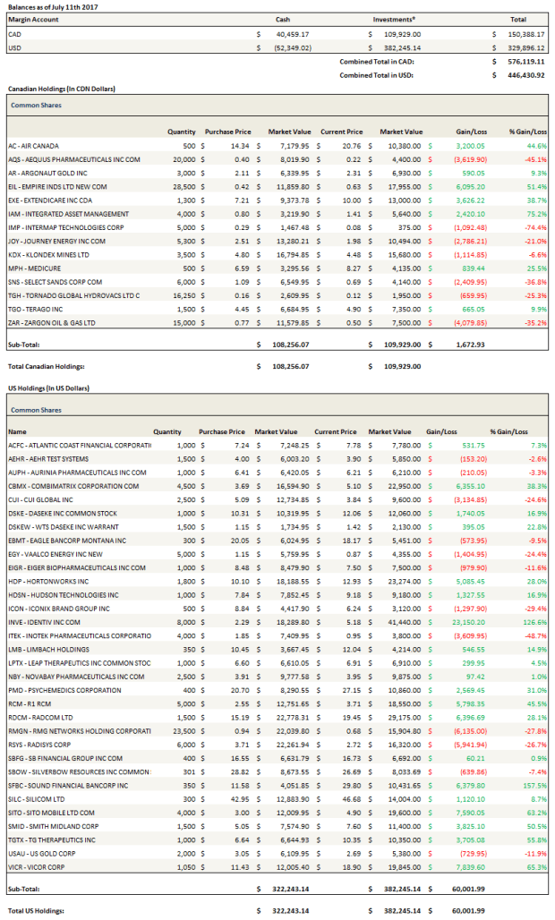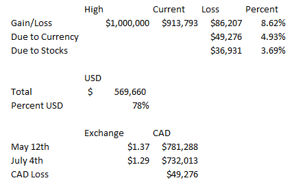 The Canadian dollar has been a massive headwind for my portfolio over the last 2 months. I created a simple little spreadsheet to quantify just how much of a headwind it has been. Below I have recreated that spreadsheet but normalized to a starting amount of $1 million so we are looking at round numbers. Since mid-May the majority of my losses have come from the Canadian dollar.