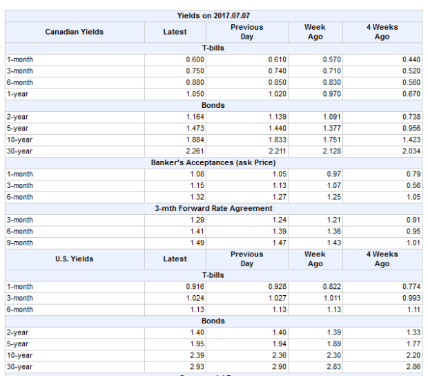 While the Canadian dollar/oil relationship has went out the window over the last two months, the yield spread relationship has not. Below is a table taken from the Financial Post website that shows Canadian and US Government bond yields. I tried to find a chart to update the one above but could not. Nevertheless, looking at even just the last 4-week data in the table, its clear that Canadian yields have risen substantially while US yields have only risen modestly. The spread has risen from -0.592 to -0.236.
