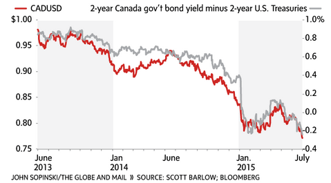 Scott Barlow, who is a writer at the Globe and Mail, had an interesting piece on the Canadian dollar a couple of years ago. In it he pointed out that there was a strong correlation between the Canadian dollar and oil, which is not surprising, but also an even stronger correlation between the Canadian dollar and the yield spread of the US 2-year Treasury and the Canadian Government 2-year note. He presented the chart below.