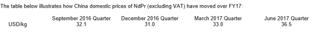 The upside here is leverage to NdPr price increases. Below are NdPr quarterly prices from the Lynas full year report ending June 30th.