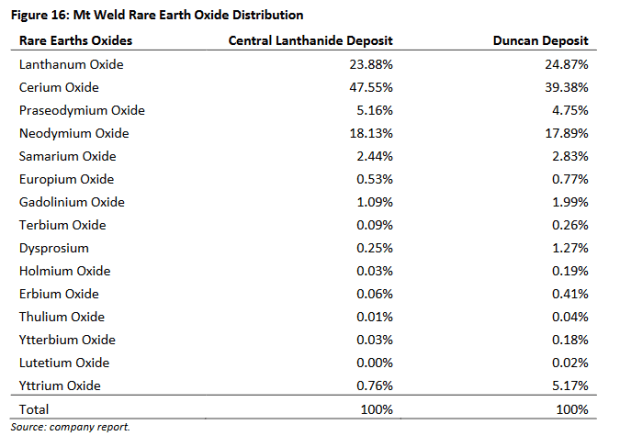 The Mt Weld mine produces 2kg of other REEs for every 1kg of Nd. In Fiscal 2017 the mine produced 5,200t of NdPr.