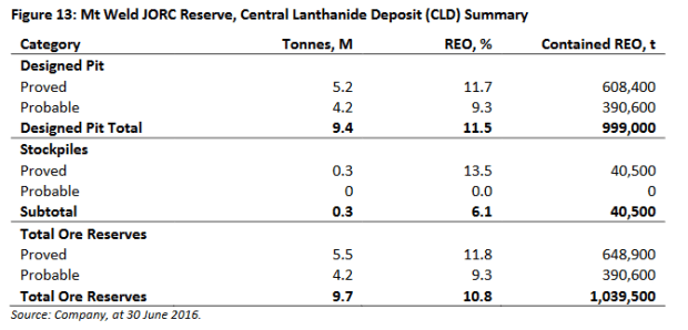 The company has a single operating mine, Mt Weld. The mine produces material via the Central Lanthanide deposit. Reserves at Central Lanthanide are 9.7Mt of rock at a 10.8% rare earth oxide (REO) grade (from this report). Below is a table of reserves at Central Lanthanide: