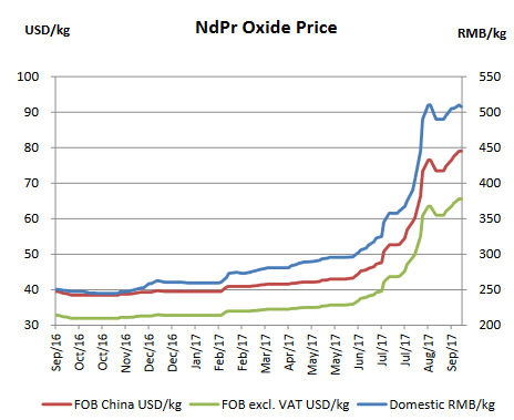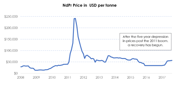 Keep in mind that even with the jump in prices, NdPr is still below what it was at a few years ago and not even close to the bubble levels it reached in 2011.