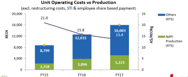 As Lynas has gotten the levers of production under control, volumes have improved. At the same time direct mining costs have dropped by about one-third since 2015.