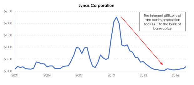 I mentioned in my last post that mining rare earths is difficult. The history of Lynas is an example of that. The company started mining at its Mt. Weld mine in 2013. It was immediately plagued with operational problems. This wasn’t helped by collapsing prices for rare earths. The stock, which peaked at over $2 during the rare earth boom of 2011, collapsed into its current penny stock status: