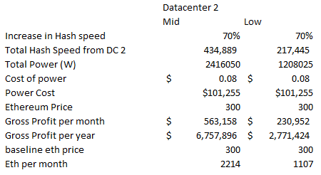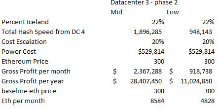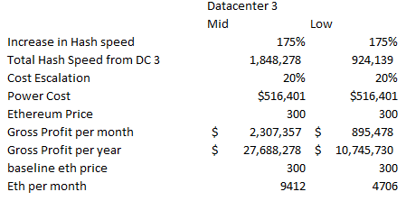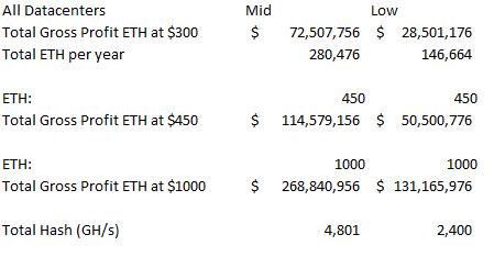 So where does this all leave us? Well HIVE may not be super cheap, but neither does it appear to be outrageously expensive. I actually think it’s a pretty interesting way of playing the rise in the Ethereum price (this is something I never would have expected to say a month ago!). Below is the summation of the profitability of all of the 4 data centers at 3 different Ethereum prices. Again, remember it’s the low case column that is the likely one, at least given the information that is available.
