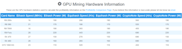 One other possibility is that there are indeed 10 GPUs, but they are lower end processors. My assumption above was based on the RX 470 card, which has processing speed of 27 MH/s. I’m told this is one of the most efficient cards. But maybe the Iceland data centers use R9 280s, which would have a little more than half the processing power as the RX 470s (see the table below). That would get us closer to 10 GPUs per rig while still staying within the $4 million gross mining margin range.
