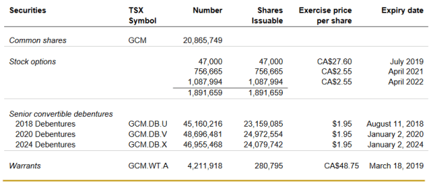 Dilution amounts to 18.8 million shares. This compares to 72.2 million shares that would have been issued under the existing 2018, 2020 and 2024 debentures if they were fully converted (the table below is from the third quarter MD&A filing).