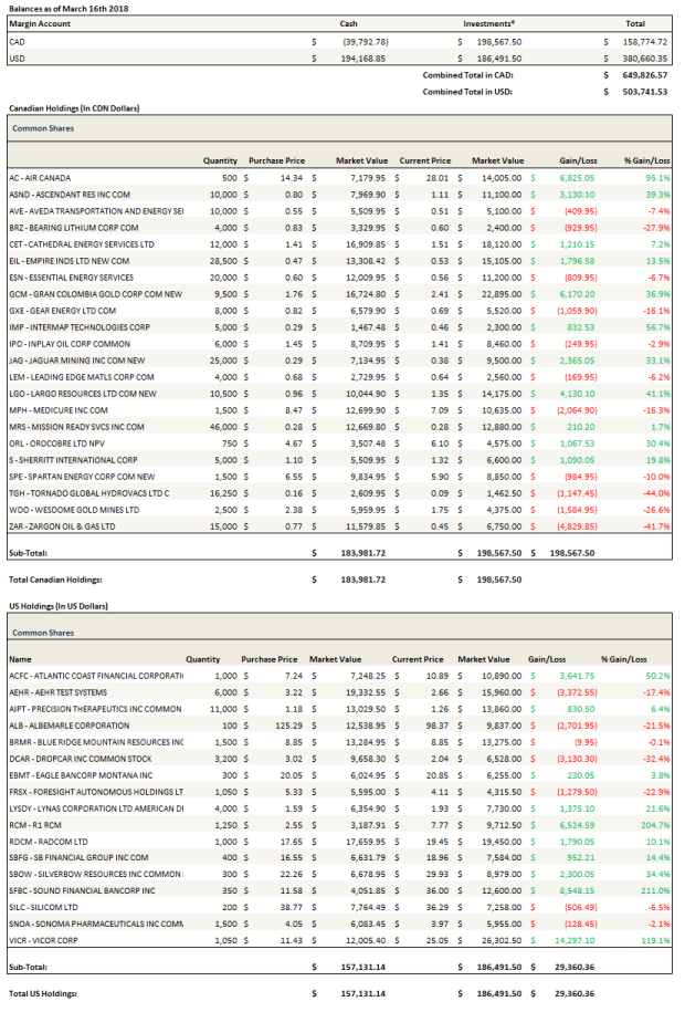 I sold Essential Energy this week (this was after the portfolio date so its still in the list of stocks below). I listened to their fourth quarter conference call. Its hard to get excited about their prospects. Drilling activity in Canada just isn’t coming back. I’m going to stick with names like Cathedral and Aveda that have more US exposure.