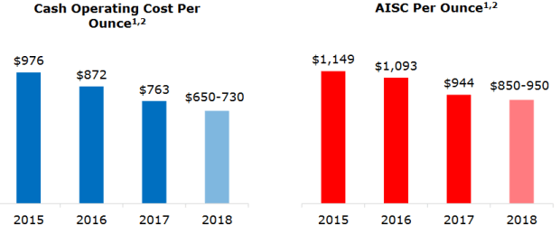 I’ve watched the company on and off for years. They have always been one of the highest cost producers. Cash costs typically exceeded $1,000/oz. This is what cash costs and all-in-sustaining costs (AISC) looked like from 2013 to 2015:
