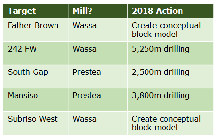 Apart from getting Prestea up to plan, the big news will be exploration results. The company is spending $6.6 million in 2018, split between Wassa, Prestea and new targets around the Prestea and Wassa complexes.