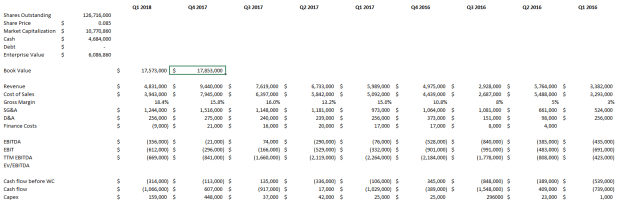Bottom line is that the stock is reasonable and I think its not a bad bet that they can have a breakout quarter one of these days. Book value is over $17 million while the enterprise value is $6 million.