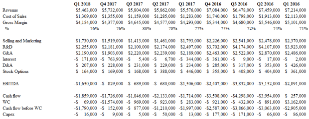 The struggles have continued up until today.  Over the past few years the company has had a difficult time creating positive EBITDA and revenue growth has been in reverse.  Revenues bottomed out at $22 million last year.   It’s gotten bad enough that the company included going concern language in the 10-K.
