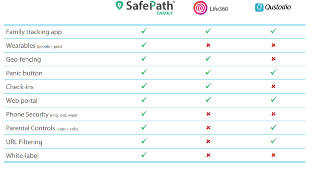 SafePath isn’t a unique offering.  There are several apps on the market that offer a combination of the features.  Each carrier seems to offer some sort of flavor.  And there are freeium products available at the app stores, such as Life360 and Qustodio which are the comps used in the table above.