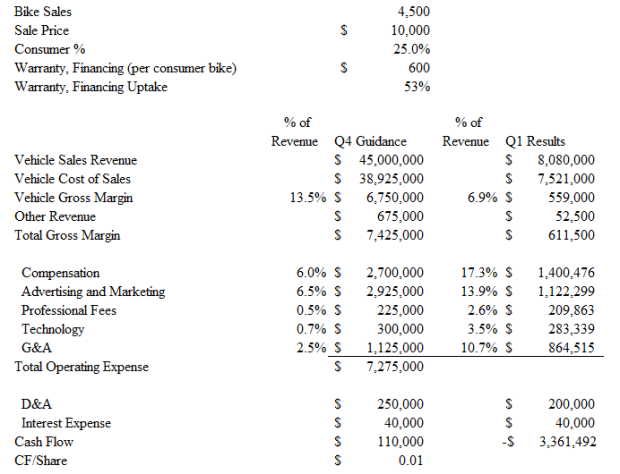 Berrard laid out where they would be in terms of costs by the fourth quarter. They also said the goal is to be cash flow positive by the fourth quarter. Guidance for the year is $100 million of revenue, 10,000 bikes sold.