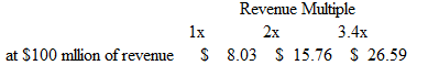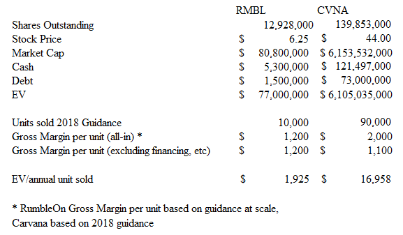 Here’s a table of what RumbleOn’s market capitalization looks like at different revenue multiples and $100 million of sales. The 3.4 multiple is based on Carvana’s forward 2018 revenue multiple.