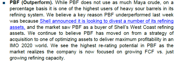 PBF announced on Tuesday that they were buying the Martinez refinery from Shell. I guess the stock slid because of worries about debt. Some analysts were also taken by surprise, having not expected PBF to make an acquisition. Consider this piece from Credit Suisse a few weeks prior: