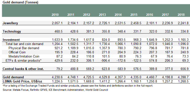 Here is the breakdown of gold demand from its major sources over the last 9 years.