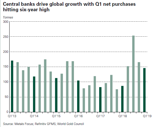 Related to this thesis would be that Central banks step up their purchases. Central banks purchased 145 tonnes in the first quarter. They account for roughly 15% of purchases.