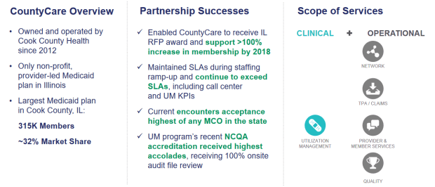 A second Evolent client that has been in the news (negatively) is Cook County’s CountyCare. They were highlighted as a partner in Evolent’s May investor day.