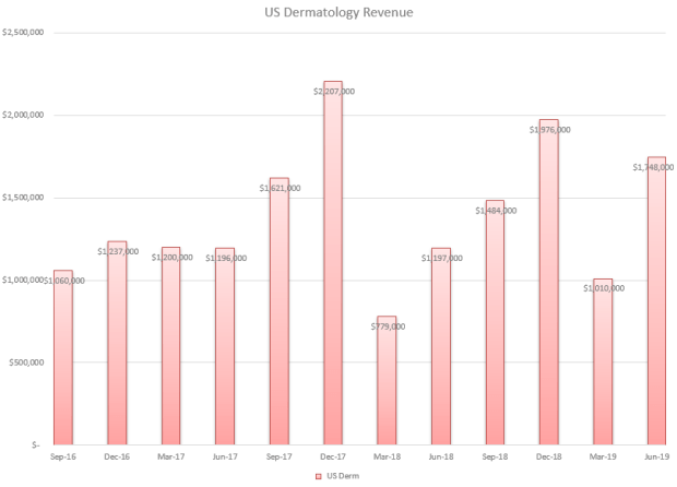 In the first quarter of 208 growth in the US dermatology segment stopped abruptly. Revenue for the March 2018 quarter was $780,000, down from $1.2 million the previous year.