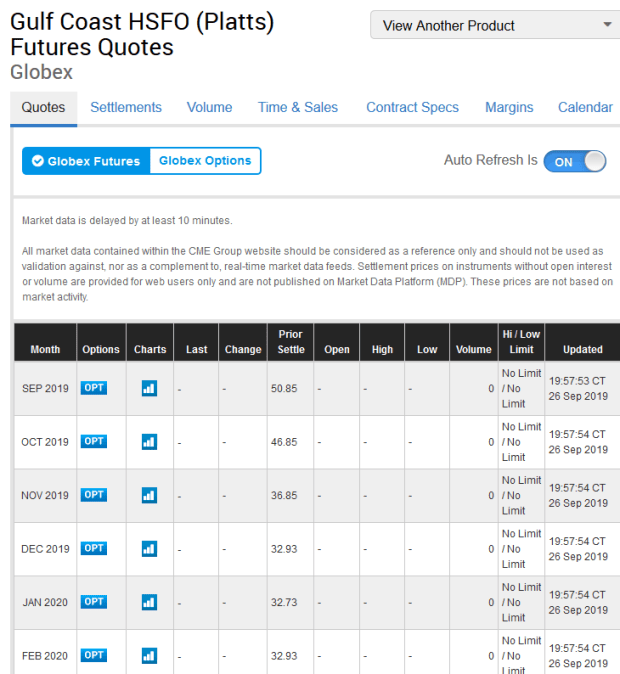 The CME Futures are saying as much.   This screen capture was taken last Thursday when the September contract was still trading.  The backwardation in HSFO between September and January was close to $18/bbl!