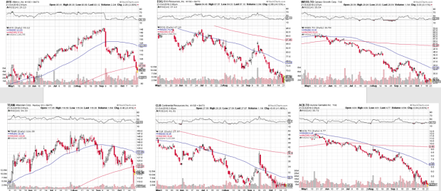 When I look at the three sectors that underlie these six charts (SaaS, pot stocks, oils), I don’t see much in common.