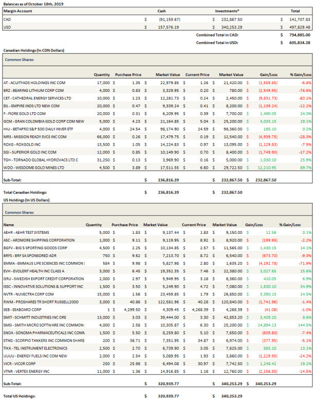 To balance my long portfolio, I am keeping a higher than usual level of hedging by way of inverse index ETFs. As well I remain short a few individual names. My shorts are the same as they were at last mention – a few SaaS names, a couple biotech’s with questionable histories, a couple of cannabis names that are levered to a Canadian extraction market that appears to me to be very oversupplied, a couple of US shales that are seeing their access to debt dry up and that I believe will struggle as a result, and a couple of Canadian banks that I will continue to be wrong about.