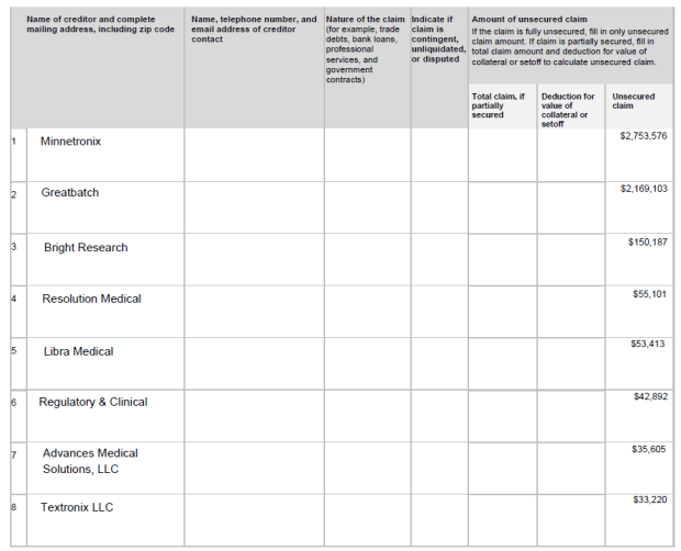 Finally, the bankruptcy report released showed only a little over $5 million of unsecured creditors and almost all of that are due to the two manufacturers, Integer/Greatbatch and Minnetronix.