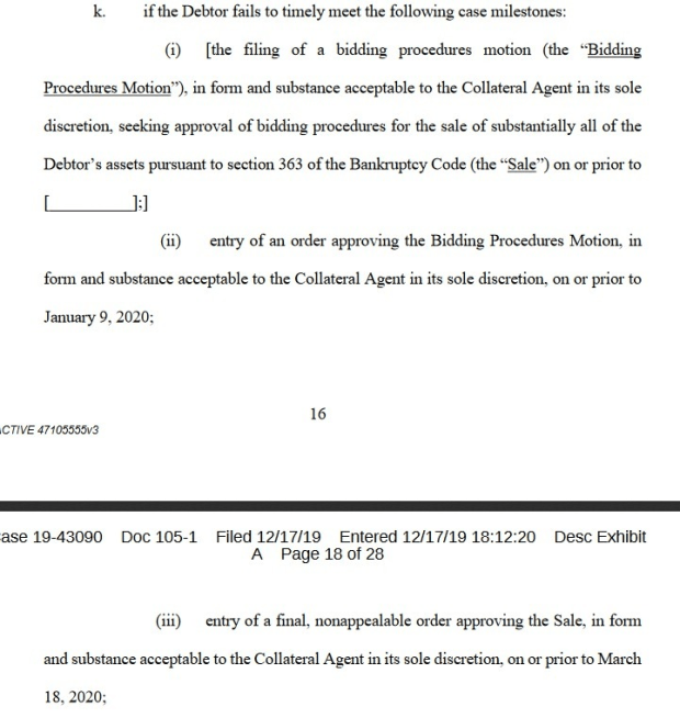 The one other thing relevant thing that has been settled is the schedule.  It looks like the process will take place quickly.  The plan is to have bidding procedures approved by January 9th.   The auction should be complete by March 18th:
