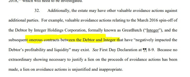 One other interesting point is that Nuvectra came out with their list of executory contracts they wanted to reject.   Integer/Greatbatch wasn’t among them.  Also, in a separate document intended to list the contracts to be retained, there was no mention of Integer/Greatbatch either.