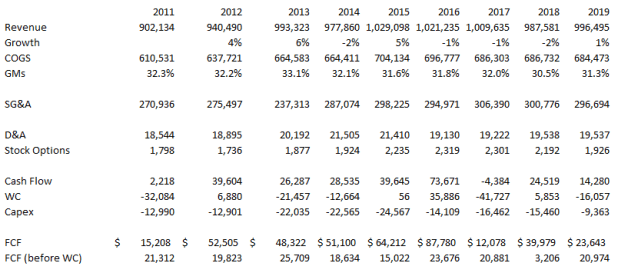 • Sorry if the comment came across poorly. If there is one thing that I wonder about with BGFV it is why working capital has been consistently negative. If you look at the table I made, FCF before working capital is nearly double that of just FCF in the last 9 years. Seems odd?