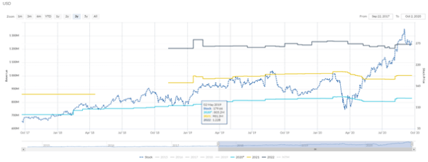 - So really take a look at this chart. This chart is not just showing 2020. Its showing 2021 and 2022 estimates as well. So we are looking at changes to analyst revenue forecasts for next year and the year after. And, um, they have hardly changed. This is the big “pull forward” in software adoption? Really? Because it looks pretty damn flat to me. The stock is up a ton. But the forecasts – not so much.
