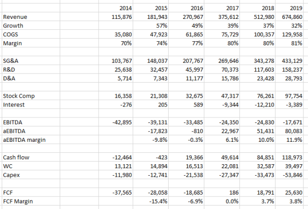 - what strikes me as well is that in the last 5 years their top line has grown 6x but really their EBITDA loss has only shrunk like by like $25mm. And if you want to argue that its because of the sub-growth – that MS argument that growth is masking true profitability, then why don’t we see EBITDA improvement accelerating as their growth rate goes from 57% down to 32%