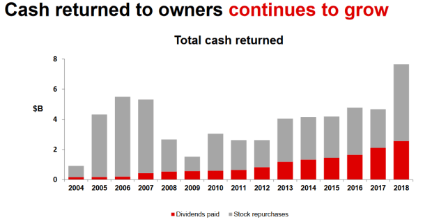 But Texas Instruments gets a reasonably strong valuation because the company has been very good at returning cash to shareholders. In particular, Texas Instruments is excellent at repurchasing stock.