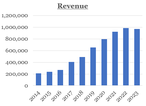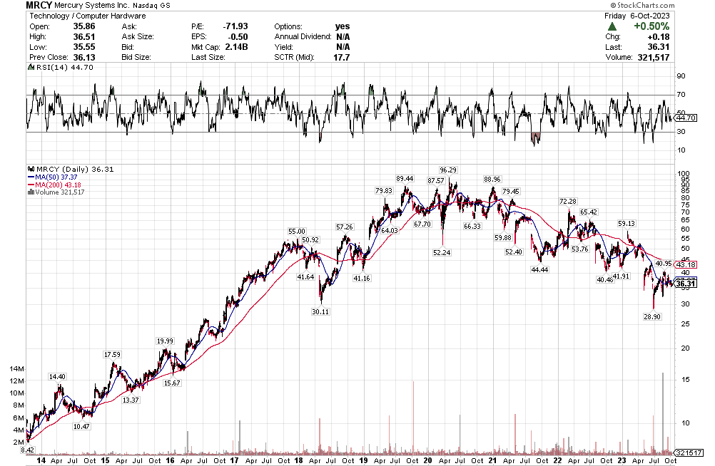 Mercury was a growth stock up until this year.  The company grew revenue at an average rate of 22% per year from 2014 until 2023.  Then it stopped.