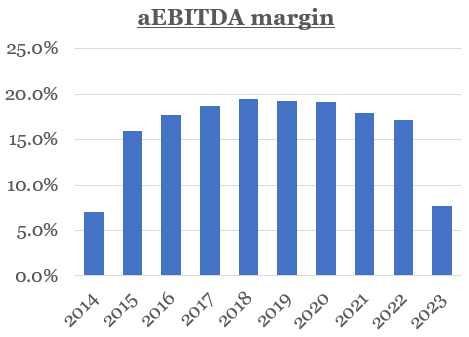 During the years that Mercury was a growth company, they maintained pretty consistent EBITDA margins.  The dip in margins in 2021 and 2022 could have just been COVID supply chain, more maybe it was the beginning of the bigger issues we see now.  It’s hard to really say.  But margins didn’t really collapse until this year.