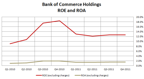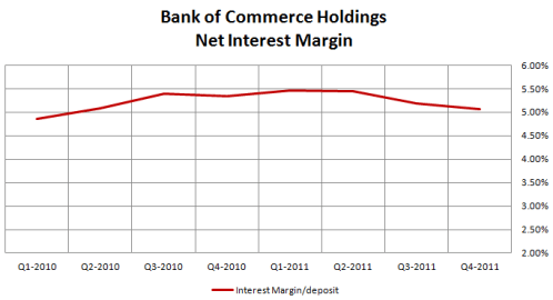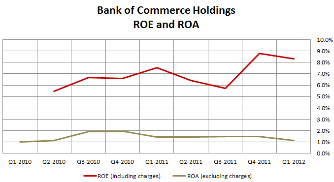 Much like Rurban, the first quarter seasonally has lower mortgage banking revenues than does the fourth quarter so I am not concerned about the decline in ROE and ROA sequentially. Mortgage banking is a big part of Bank of Commerce Holdings banking business so they are subject to these seasonal effects. What is more relevant is the trend in mortgage banking revenues. They have climbed substantially from $2.5M in Q1 2011 to $5M in Q1 2012.