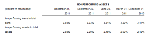 The loan book deteriorated over the quarter. The company had to put aside provisions for credit losses of $8.4M, which was way up from $4M in Q4 and $6.4M in Q1 2011. Nonperforming assets rose to 8.1%. I had been hoping that nonperforming assets had peaked in Q3 and would continue to roll over in Q1. Unfortunately not.