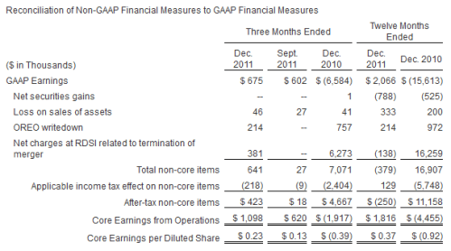 “Our goals for 2011 were to make major improvements in our problem assets and to rebuild the fundamentals of the core bank, and I am pleased to report that we accomplished our goals. Both nonaccrual loans and net charge-offs saw continual and substantial declines throughout the year. At year-end our ratio of nonperforming assets to loans and other real estate was at its lowest level since the first quarter of 2010. Additionally, the fourth quarter showed a strong increase in new loan production in our targeted growth areas. All of this occurred while we lowered noninterest expense for the year by 21%.