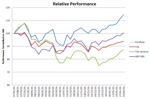While it was another good week for the S&P and a decent week for my portfolio it was not a great week for the TSX. Again. This is becoming a pattern. Its striking how badly the TSX is underperforming so far this year. The S&P is up almost 6%, the TSX is up hardly at all.