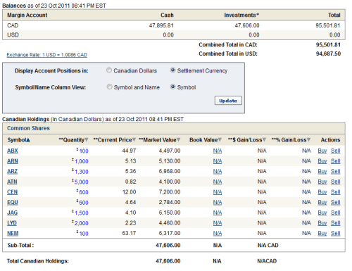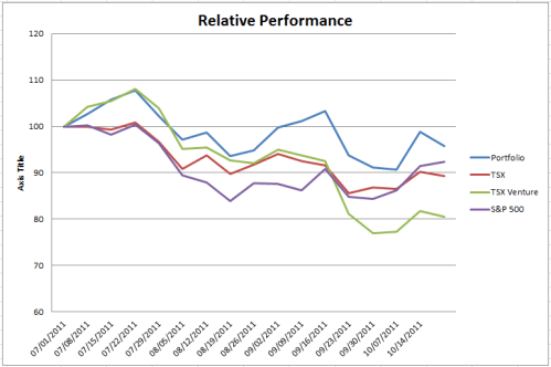 Last week was another good week for my portfolio. I tend to perform well in sideways markets. In down markets, especially those like we’ve had recently where the correlation of all asset classes go to one, I tend to underperform on an individual equity basis, because the stocks I own are for the most part small caps and commodity stocks, and they get hit harder than the broader market. I’m trying to mitigate that with my currently high cash position, and it has done its job and dampened the effect.