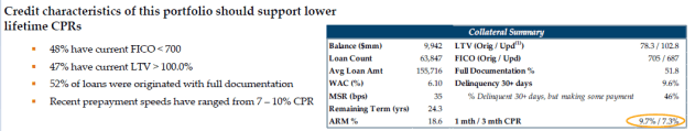 Its worth pointing out that so far the 1 month CPR on the pool of mortgages Newcastle has purchased is 9.7%. The 3 month CPR is 7.3%. However, you have to expect that the CPR is going to increase rather substantially over the next couple of years. Why? Because of the government’s HARP II program, which allows homeowners with upside down mortgages to refinance those mortgages. Presumably this program is going to garner a lot of interest from folks with high loan to value amounts and you are going to see a refinancing spike.