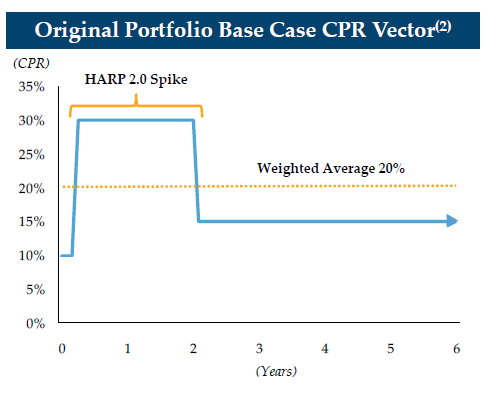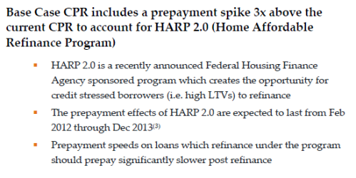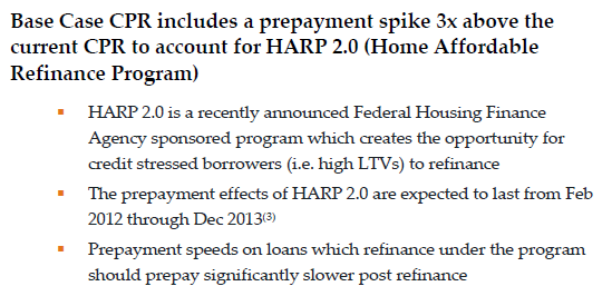 Newcastle has actually modeled the effect of HARP II assuming a spike in prepayments to 30% for the duration of the program (until December 2013). That 20% number that I mentioned is actually a weighted average over the life of the MSR’s. Newcastle provided the following chart to show how they are accounting for the spike in refinancings expected due to HARP II.