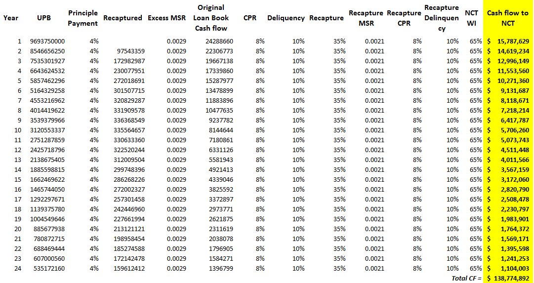 The first point illustrated by the model is how much the cash flow changes from year to year. This is not a fixed return investment. The cash flow from an MSR is heavily weighted to the front end. The Year 1 and Year 2 cash flow decrease substantially as you move forward. While its always good to get paid out quickly, it also means that we have to be careful with respect to what we define as a sustainable dividend based on that cash flow. I’m not entirely sure whether a REIT like Newcastle has any say in the matter (they may just have to distribute 90% of their cash flow irrespective of how that cash flow stream may decline in the future, I’m not sure, I haven’t done the work to understand the rules of the REIT structure in the US carefully). But if Newcastle pays out the full $14M+ in the first year, the cash flow stream is going to decline substantially in subsequent years and Newcastle is going to have to find equivalent return investments to sustain that cash flow.