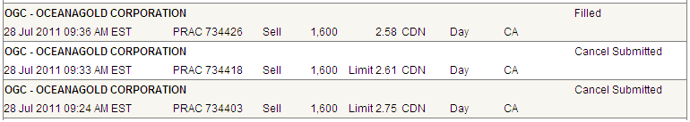 When I read bad news, I have found it is usually better to sell first than it is to wait for the reaction to play out. It is better to “panic”. Why you would buy and hold a stock that you know is sure to go down, even if it is only in the short run? In OceanaGold’s case, it was clear that at $2.70 or even $2.50, the share price was too high given the severity of the quarter. The stock had traded to $2.20 only weeks before news of the quarter came out. Certainly one could expect it to trade to at least $2.20 once such news was public.
