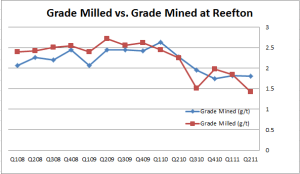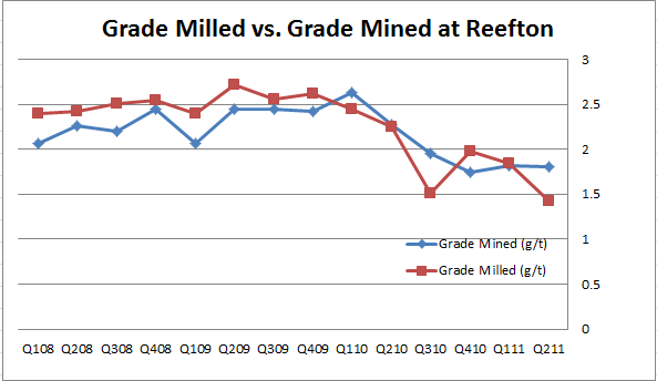 At Reefton, management said the problems are entirely attributable to workforce turnover. They had a bunch of their miners quit, and the new miners weren’t as efficient. So they had to mill low grade stockpiles. You can see the low grade milling in Q2 versus previous quarters below.
