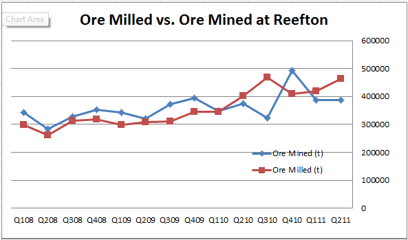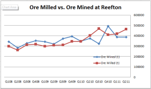 What is somewhat puzzling about the reason given is that when you looking at the mining output at Reefton over the last few quarters, it really doesn’t suggest that severe of a deficiency in ore. And from the figure above, mined grade for the quarter was actually quite a bit higher than milled grade (~1.8 g/t versus ~1.4 g/t).