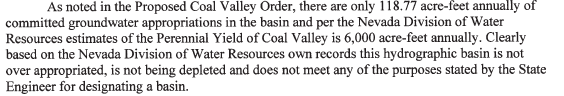 Now will any of this water be granted to Vidler? That is a whole other question and it still makes these assets pretty much impossible to put a $ value on other than $0. Note that the filing I snipped the Coal Valley paragraph from was a written opposition to a motion to designate that land, which, if granted, I think would limit the water that can be removed, maybe by quite a bit. So if that went through it would limit what Vidler could extract. Overall it’s not at all clear when and if this water will be available to Vidler.