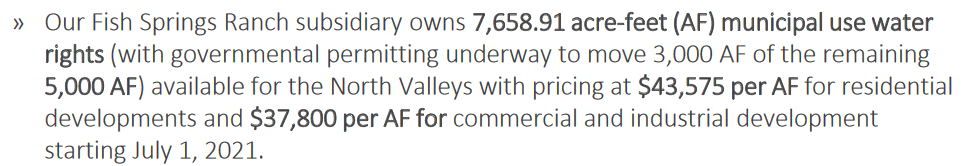 At $40k the approved water alone is worth $300 million+. (note: I should be clear on this – Fish Springs is a 51/49 partnership between them and the TMWA. But Vidler gets cost recovery first, which currently is $205 million and accruing at ~4.75% per year. So if it was sold today at $300 million, Vidler would get $256 million of that. More likely though this water is sold over a number of years as land is developed so the accruals will increase Vidler’s chunk. Next year the first $213 million accrues to Vidler, the year after that the first $224 million, and so on… in fact, I think you could argue that if Vidler can continue monetize all its Arizona LTSCs over the next couple years, using the proceeds to buy stock, it would be in shareholder interests to hold Fish Springs and let it continue to accrue to Vidler).